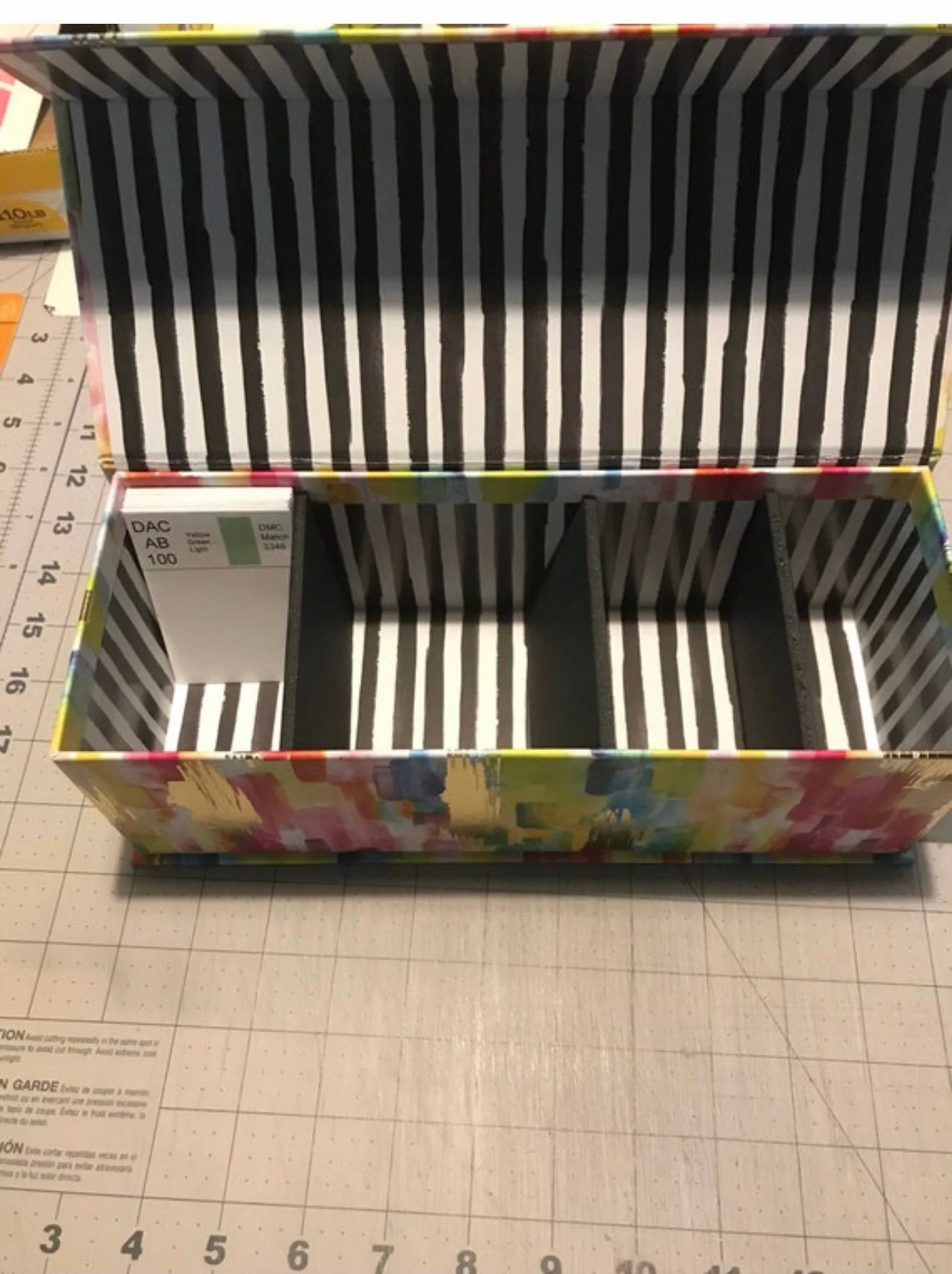 Box contains a set of AB DMC dividers and 3 main row dividers. All in a metallic colored box with a magnetic front closure.