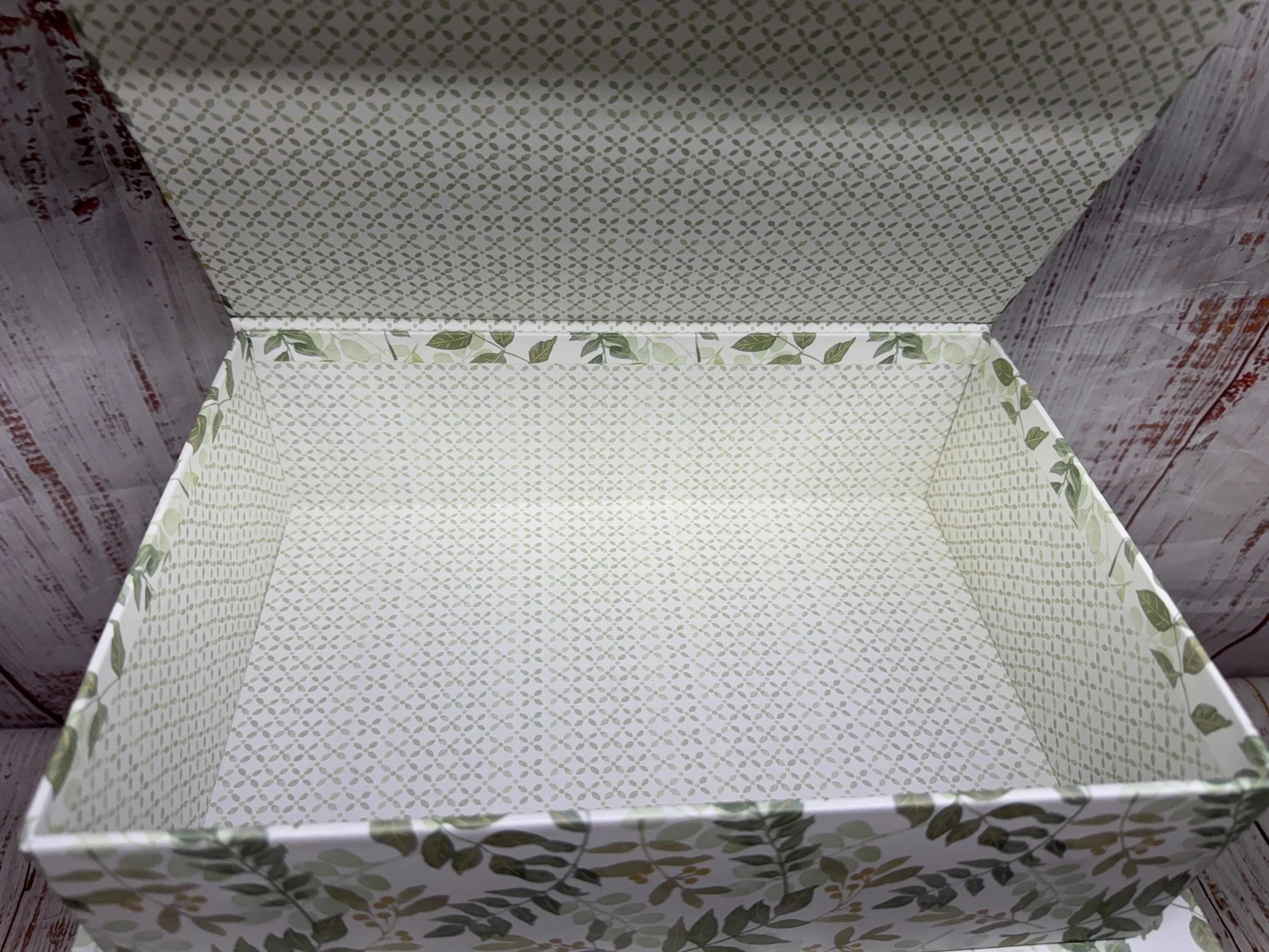 Lift off lid closure. (Interior pics are not of the inside of this box. The colors inside will be different)