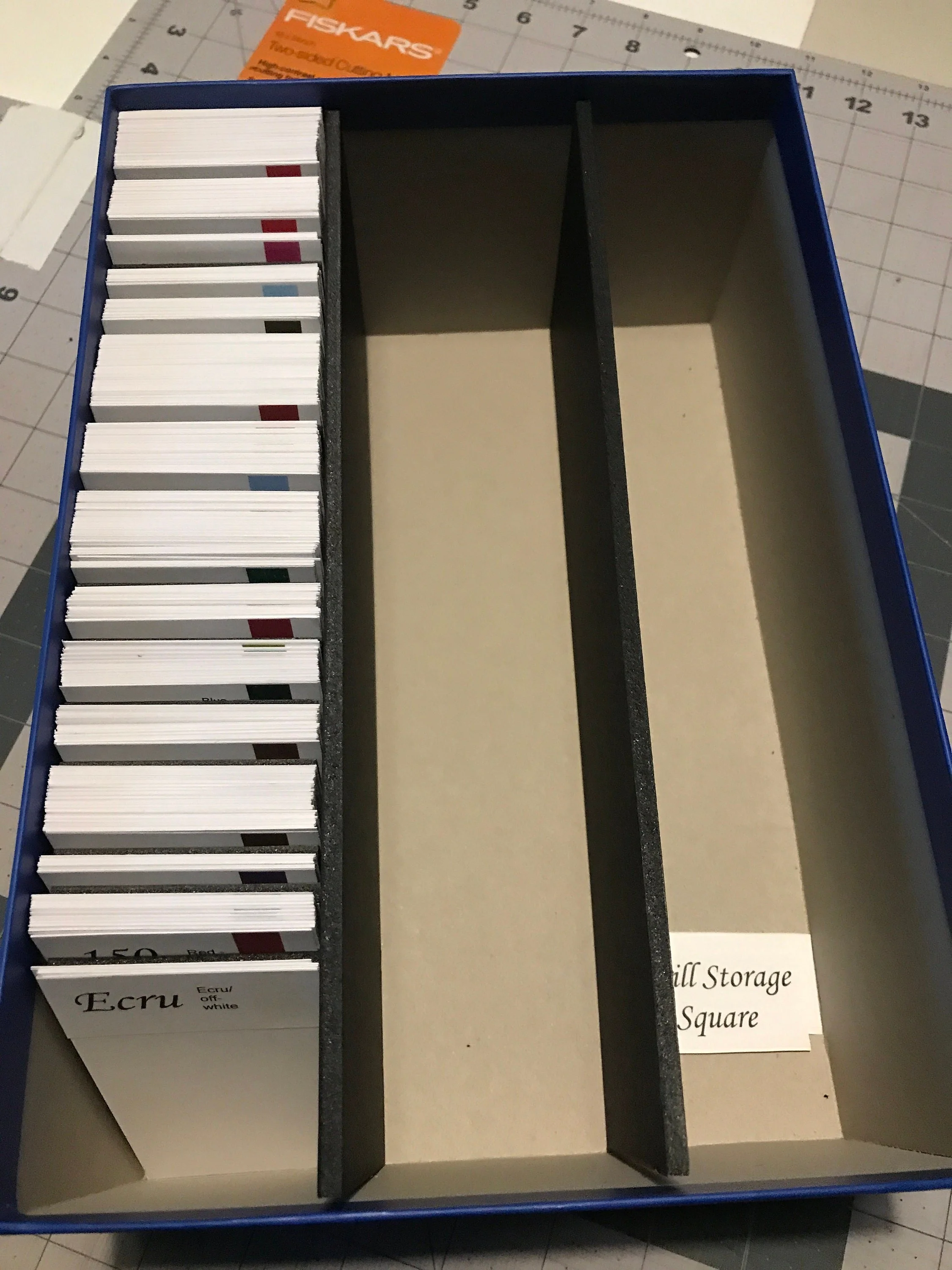 Kit contains: -Empty storage box. -Dmc labels (456 labels, 14 lot divider labels and 5 other labels used for box labeling). -456 blank dividers. -2 main row dividers. -14 lot dividers.